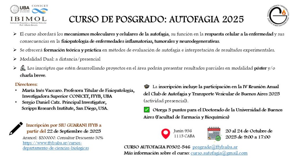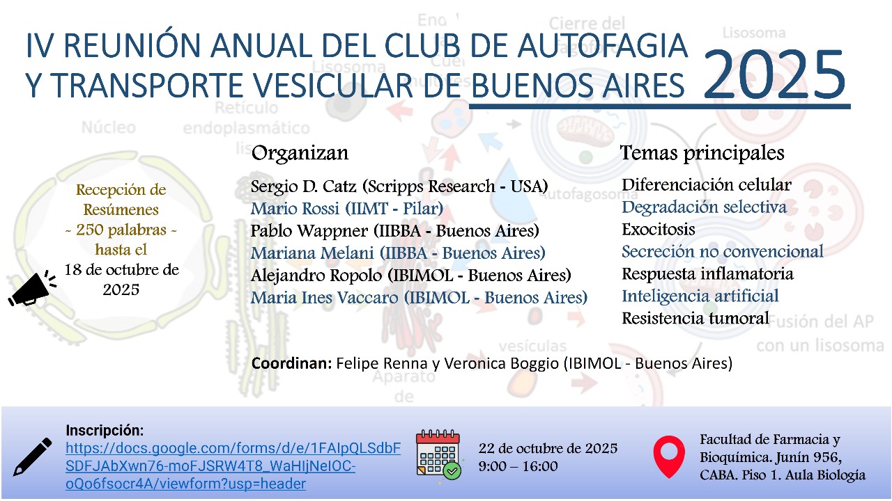 Noticias / Reunión del Club de Autofagia y Transporte Vesicular Club de Autofagia y Transporte Vesicular Reunión del Club de Autofagia y Transporte Vesicular Autofagia y Transporte Vesicular Compartir en redes socialesCompartir en FacebookCompartir en Twitter Publicado el 16 de octubre de 2025 Tags:Autofagia Transporte vesicular CompartirCompartir en FacebookCompartir en Twitter